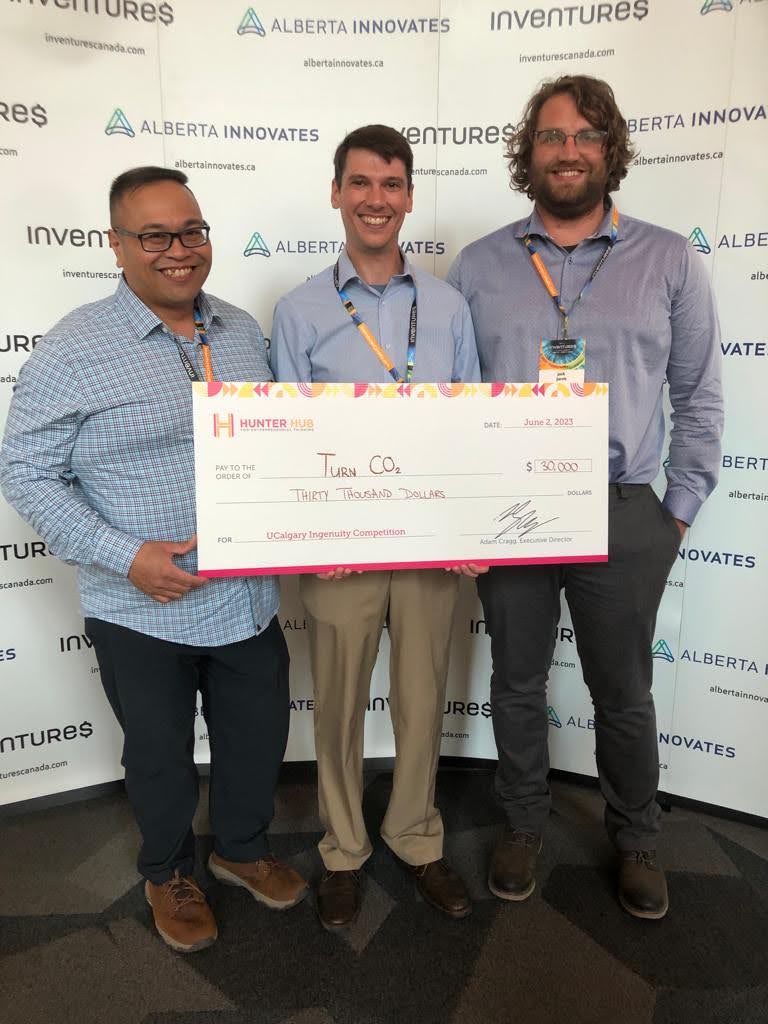 3 of our co-founders celebrating our win at the UCalgary Ingenuity competition during Inventure$ 2023! The prize has enabled us to acquire essential tools to de-risk our innovative carbon capture technology. Read More Here
